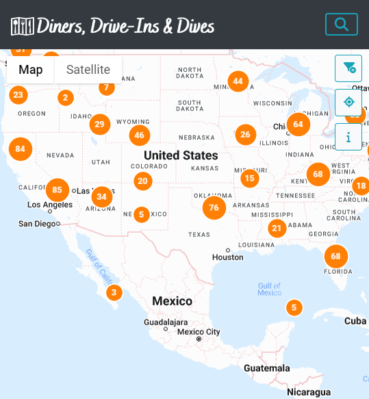 A map showing restaurant locations from Guy Fieri's Diners, Drive-Ins and Dives Food Network television series.