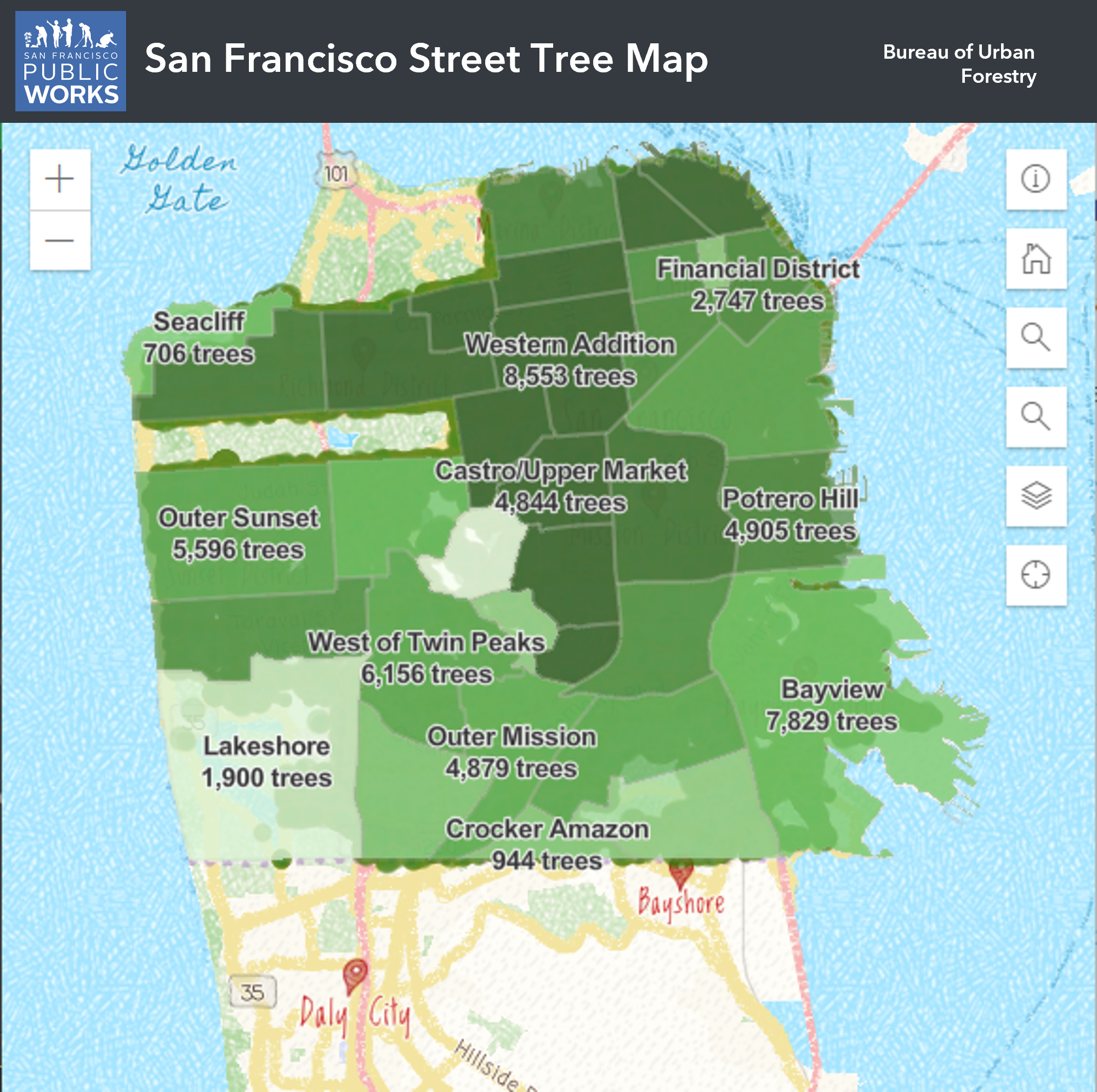 The Street Tree Map is an online database and map of San Francisco’s street trees containing information about location, species, pruning schedule and more.